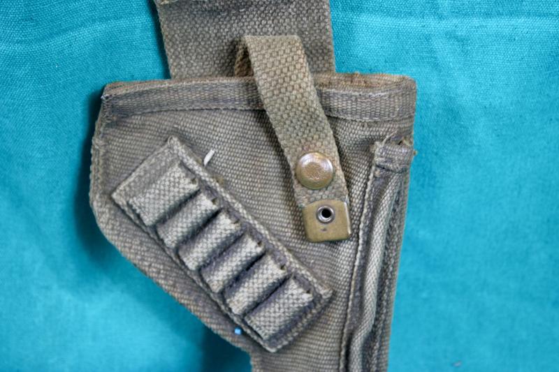This is a blancoed webbing holster more commonly known as the tankers holster as it was only issued to armoured crews. This example is not dated or marker marked.