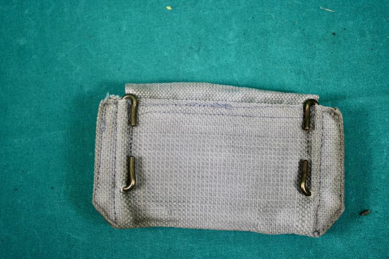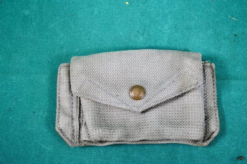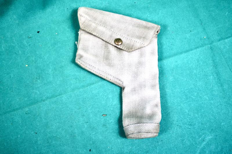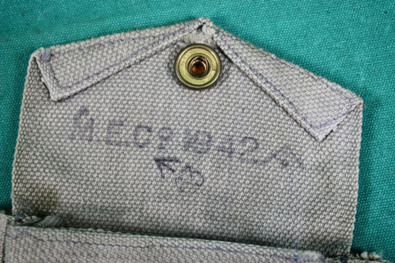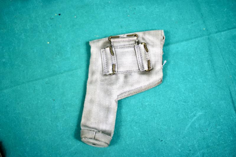RAF issue 37 pattern holster with ammunition pouch. The holster is maker marked M.W.&S.LTD ( Martin Wright & Sons ), dated 1943. The ammunition pouch is maker marked MECo ( Mills Equipment Company ) and dated 1942. The RAF blanco has faded to a very light blue.