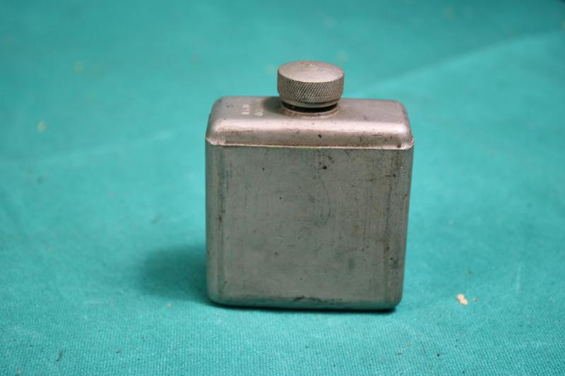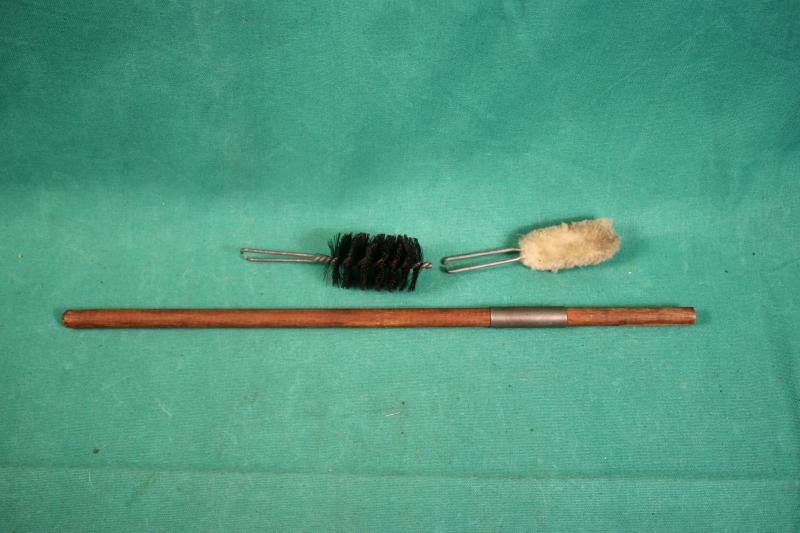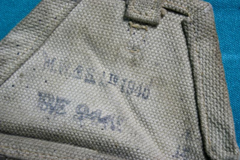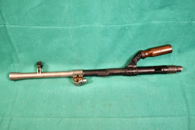 This is a 1945 dated spare barrel pouch with contents. The pouch is maker marked M.W&S.LTD ( Martin Wright & Sons ). The contents includes a deactivated MK1 barrel, spare magazine, cleaning rod with two brushes, one metal and plastic oiler, one bakelite oil bottle and a MK1 defouling tool. U.K. Sales Only.