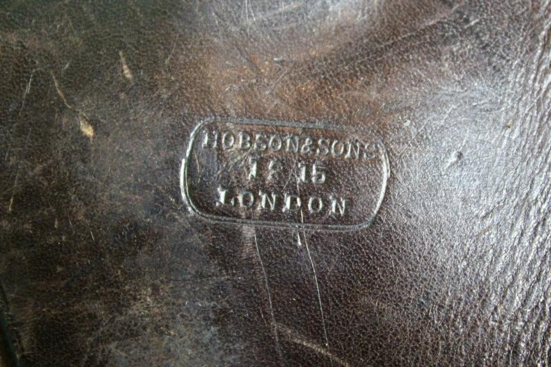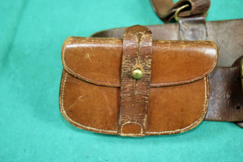 This a British officers Sam Brown set consisting of a 1916 dated belt which has a faint makers stamp, cross-strap. MKV1 Webley holster, which is maker marked Hobson & Sons dated 1915, and a ammunition pouch, which is not dated or marker marked. The belt is also named to the original owner.